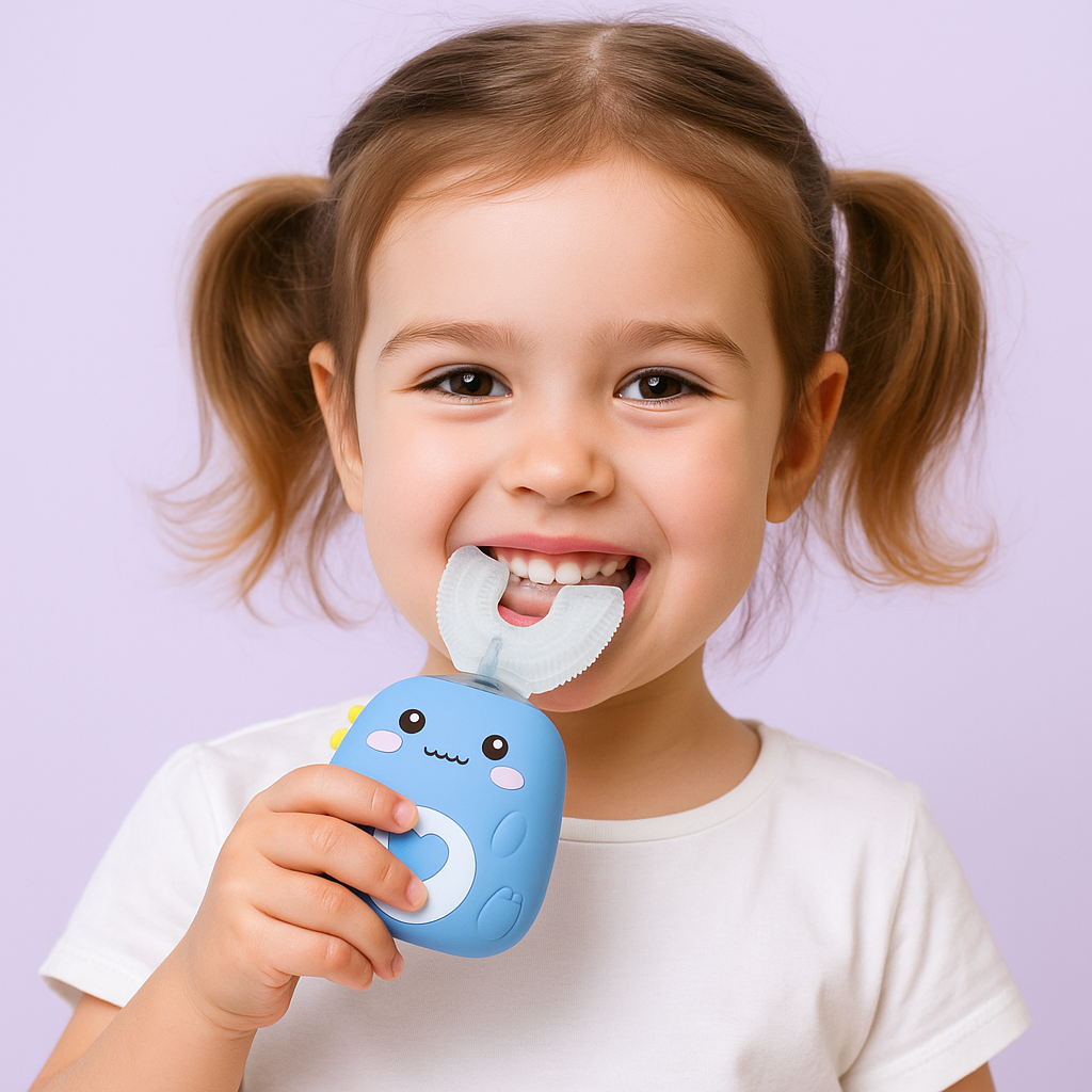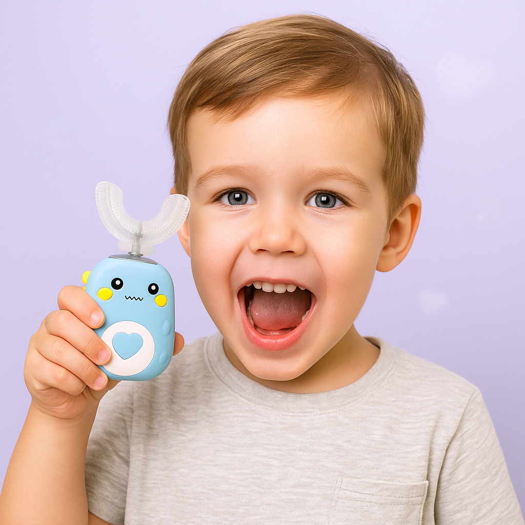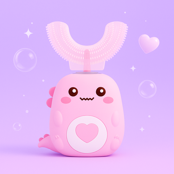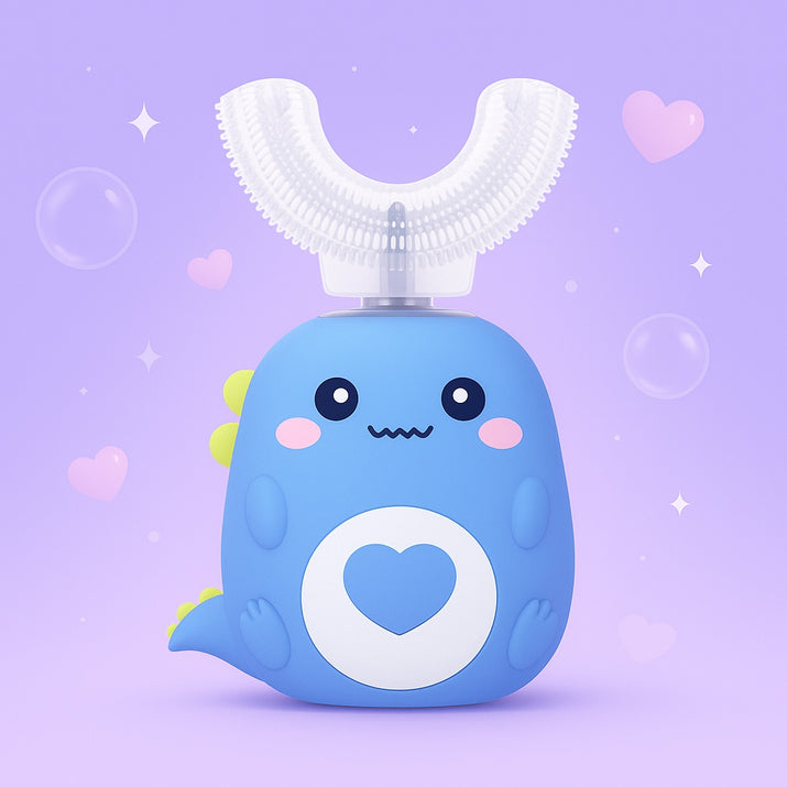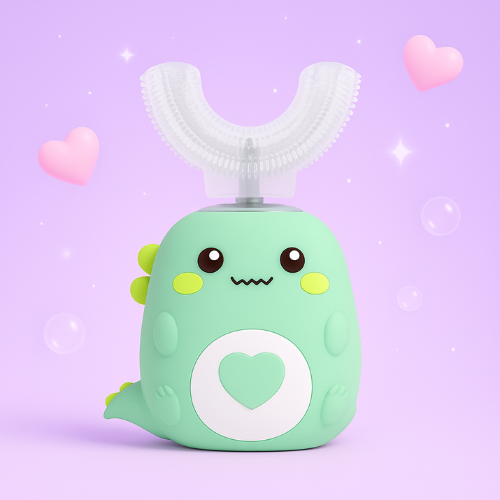 The BrilliKids™ Automatic Toothbrush makes brushing time fun, quick, and stress-free for both kids and parents. With its unique 360° U-shaped brush head, it cleans every tooth at once in just 30 seconds, taking the struggle out of oral care. The soft silicone bristles are gentle on sensitive gums while providing a deep clean, and the playful dinosaur design keeps kids excited to brush every day. Built-in songs and a timer help create healthy routines, while the waterproof, child-safe design gives parents peace of mind. BrilliKids™ turns brushing from a battle into a fun habit your child will love.